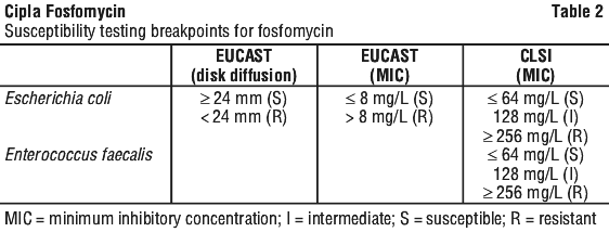 Based on CLSI criteria, only E. coli and Enterococcus faecalis from urinary tract isolates are calibrated. MIC breakpoints for both are ≤ 64 mg/L (S), 128 mg/L (intermediate [I]), and ≥ 256 mg/L (R). Disk and agar dilution MIC methods are approved provided there is supplemental glucose-6-phosphate. CLSI does not recommend broth dilution fosfomycin susceptibility testing.