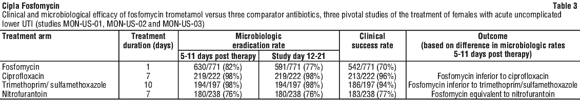 In three phase 3 prospective parallel multi-centre double-blind double-dummy randomised trials of acute uncomplicated UTI performed in the 1990s, a single 3 g oral dose of fosfomycin was compared to three other oral antibiotics (see Table 3). The study population consisted of female patients with symptoms and signs of acute lower UTI of less than 4 days duration, no manifestations of upper tract infection (e.g. flank pain, chills, fever), no history of recurrent UTIs (20% of patients in the clinical studies had a prior episode of acute uncomplicated lower UTI within the preceding year), no known structural abnormalities, no clinical or laboratory evidence of hepatic dysfunction, and no known or suspected CNS disorders, such as epilepsy, or other factors which would predispose to seizures. In the first two studies (MON-US-01 comparator arm ciprofloxacin and MON-US-02 comparator arm trimethoprim/sulphamethoxazole), adult females aged 18 years and older were enrolled and patients with renal dysfunction (defined as serum creatinine clearance < 30 mL/min) were excluded. In the third study (MON-US-03, nitrofurantoin comparator), females aged 12 years and older were enrolled and patients with severe renal dysfunction (defined as serum creatinine clearance < 60 mL/min) were excluded. In all three studies, pregnancy, immunosuppression and neutropenia were exclusion criteria.