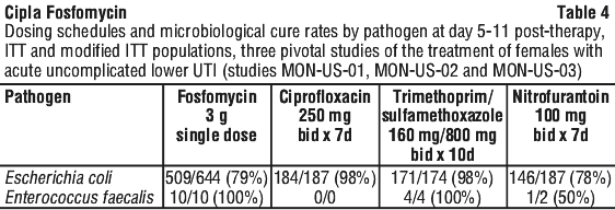 In the 3 pivotal studies, median age of patients enrolled was 27-32 years (fosfomycin) and 27-32 years (comparator arms). In all 3 studies, approximately half the patients were aged 30 years or less. The most common pathogen in the three pivotal studies was E. coli, which caused 82-86% of UTIs. Table 4 shows microbiological cure rates from pooled data from the 3 studies by pathogen.