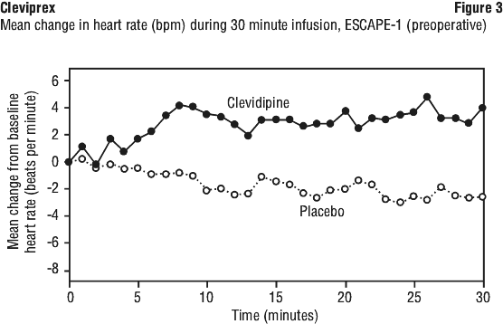 In three phase 3, actively controlled, open label clinical trials (ECLIPSE), 1,506 patients were randomised and received Cleviprex (n = 752), nitroglycerine (NTG; perioperative, n = 278), sodium nitroprusside (SNP; perioperative, n = 283), or nicardipine (NIC; postoperative, n = 193; not registered in Australia) for the treatment of hypertension in cardiac surgery. The mean exposure in the ECLIPSE studies was 8 hours at 4.5 mg/hour for the 752 patients who were treated with Cleviprex. Blood pressure control was assessed by measuring the magnitude and duration of SBP excursions outside the predefined pre- and post-operative SBP target range of 75-145 mmHg and the predefined intraoperative SBP range of 65-135 mmHg. In general, blood pressure control was similar across the four treatment groups. The primary safety endpoint was a comparison of the clinical events of death, myocardial infarction (MI), stroke, and renal dysfunction at 30 days postsurgery. Data regarding the primary safety endpoint are presented (see Section 4.8 Adverse Effects (Undesirable Effects), Table 2).