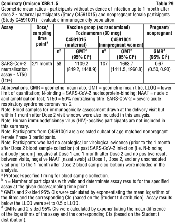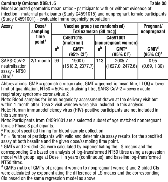 Post hoc immunogenicity results after 2 doses of Comirnaty (tozinameran) in pregnant participants 18 years of age and older with or without evidence of infection are presented in Table 30. The model-adjusted GMT and GMR were calculated based on a regression model adjusting for age and baseline neutralising titres.