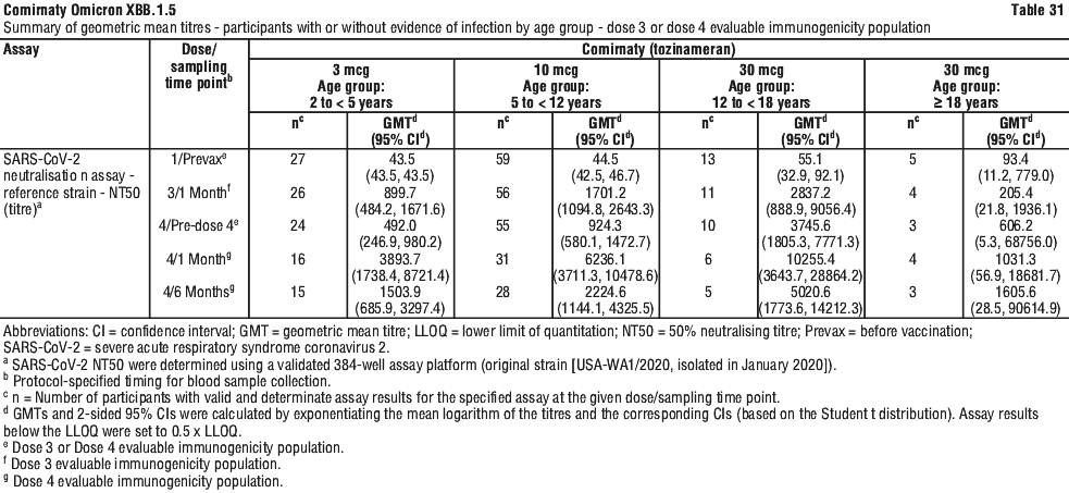 Exploratory immunogenicity results pre-vaccination and after 3 and 4 doses of Comirnaty (tozinameran) in immunocompromised participants 2 years of age and older are presented in Table 31.