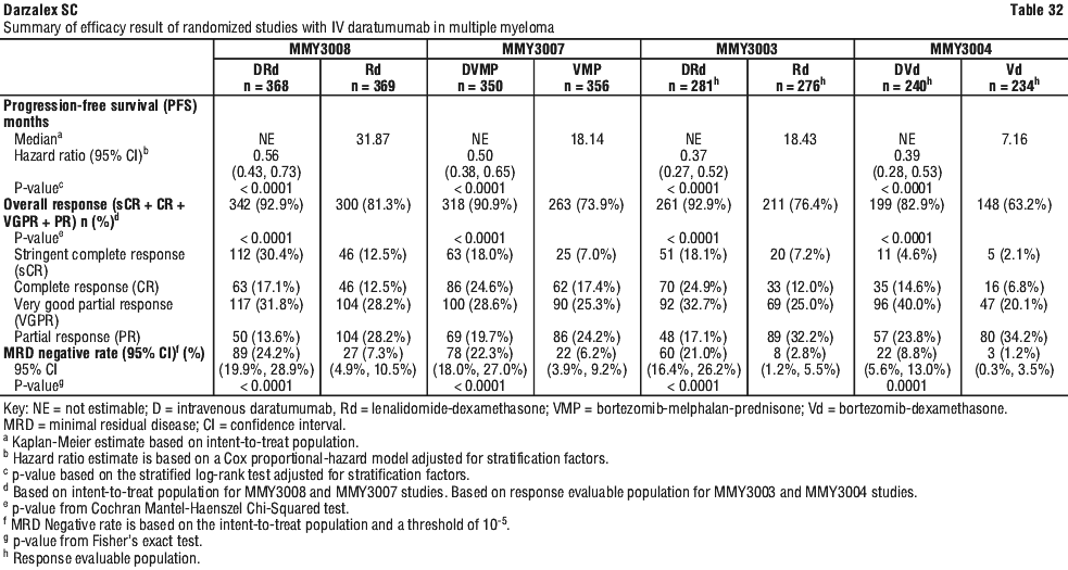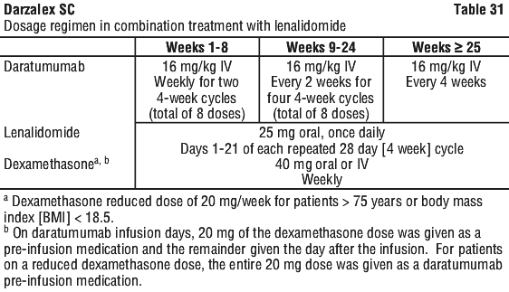 For dosing instructions for medicinal products administered with Darzalex SC, see Section 5.1 Pharmacodynamic Properties, Clinical trials and manufacturer's Product Information.