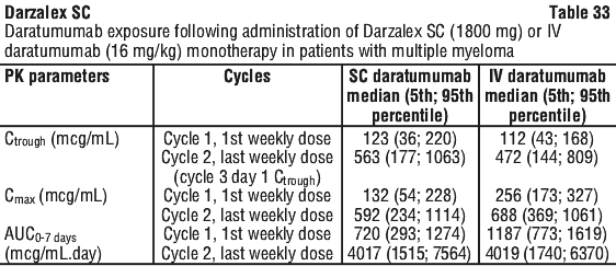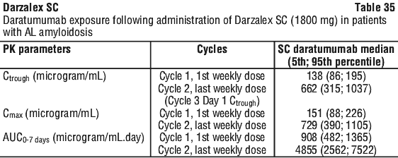 A population PK analysis, using data from Darzalex SC formulation combination therapy in AL amyloidosis patients, was conducted with data from 211 patients. At the recommended dose of 1800 mg, predicted daratumumab concentrations were slightly higher, but generally within the same range, in comparison with multiple myeloma patients. See Table 35.