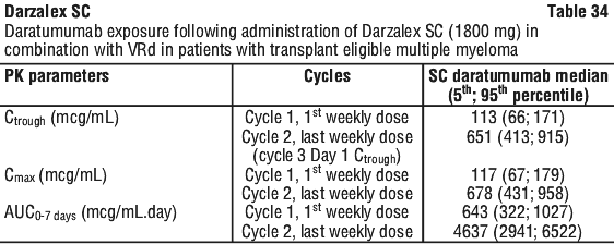 The predicted PK exposures for 526 patients with transplant eligible multiple myeloma who received Darzalex SC formulation in combination with VRd are summarised in Table 34.