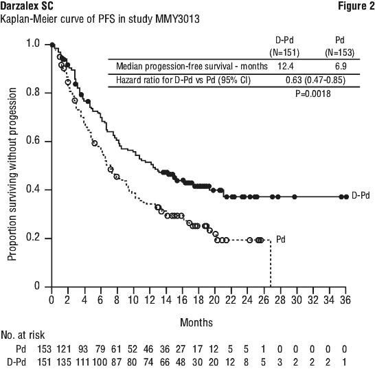 With a median follow up of 18.8 months, the primary analysis of PFS in study MMY3006 demonstrated an improvement in PFS in the D-VTd arm as compared to the VTd arm; the median PFS had not been reached in either arm. Treatment with D-VTd resulted in a reduction in the risk of progression or death by 53% compared to VTd alone (HR = 0.47; 95% CI: 0.33, 0.67; p < 0.0001). Results of an updated PFS analysis after a median follow-up of 44.5 months showed that median PFS was not reached in the D-VTd arm and was 51.5 months in the VTd arm (HR=0.58; 95% CI: 0.47, 0.71; p < 0.0001).