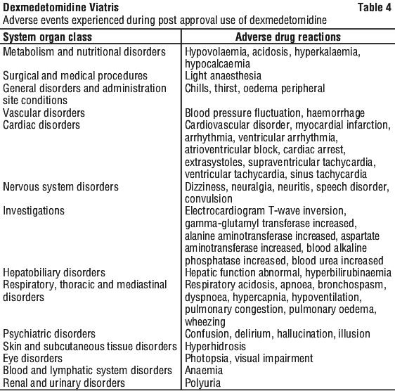 Adverse event information derived from the midazolam-controlled, continuous infusion trial of dexmedetomidine for sedation in a predominantly medical ICU setting in which 244 patients received dexmedetomidine for long-term sedation. Treatment-emergent adverse events occurring at an incidence of > 5% are provided in Table 2. The mean total dose was 72.5 microgram/kg (range: 0.1 to 489.9), mean dose per hour was 0.83 microgram/kg/h (range: 0.18 to 1.54) and the mean duration of infusion of 3.4 days (range: 0.02 to 15.6). The population was between 18 to 89 years of age, 46% over 65 years of age, 51% male and 79% Caucasian. The most frequent adverse events for this population were hypotension, tachycardia, bradycardia and systolic hypertension (see Section 4.4 Special Warnings and Precautions for Use).