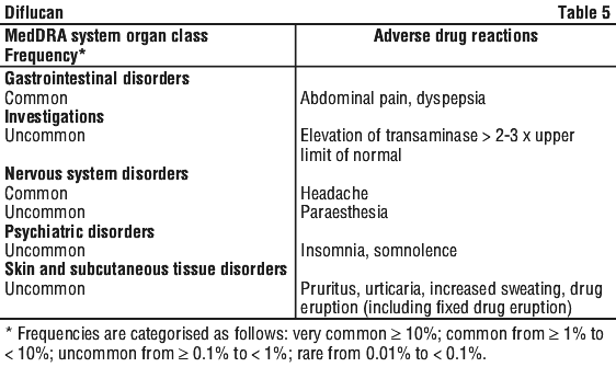 DIFLUCAN is generally well tolerated. Side effects may include nausea, vomiting, abdominal pain, diarrhoea, headache, skin rash or redness and easy bruising of the skin, seizures, signs of frequent or worrying infections such as fever, severe chills, sore throat or mouth ulcers, or change in liver function.