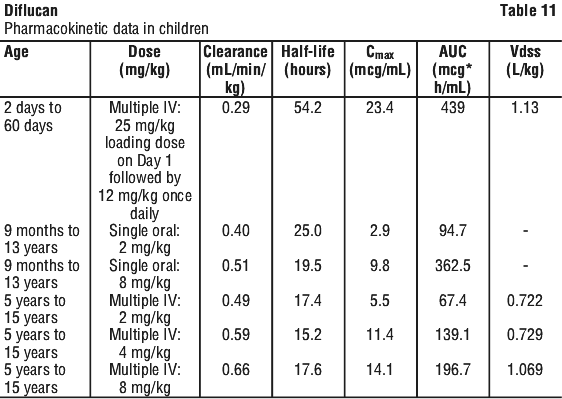 The dose for a child will depend on body weight and usually ranges from 3 mg to 12 mg per kilogram of body weight once daily. In very young children (below 4 weeks of age), Diflucan is usually given every second or third day.
