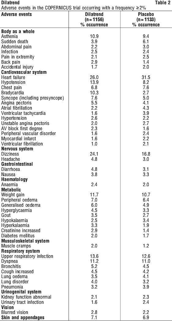 The following adverse events were reported more frequently with Dilatrend in placebo-controlled trials in patients with congestive heart failure.