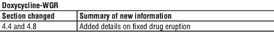 Severe skin reactions, such as exfoliative dermatitis, erythema multiforme, Stevens-Johnson syndrome, toxic epidermal necrolysis, and drug reaction with eosinophilia and systemic symptoms (DRESS) have been reported in patients receiving doxycycline. Fixed drug eruptions have occurred with doxycycline and have been associated with worsening severity upon subsequent administrations, including generalized bullous fixed drug eruption (see Section 4.8 Adverse Effects (Undesirable Effects)). If severe skin reactions occur, discontinue doxycycline immediately and institute appropriate therapy.