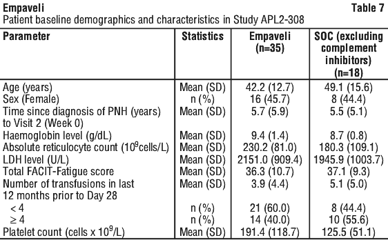 A total of 53 patients were randomised, 35 to Empaveli and 18 patients to SOC. Demographics and baseline disease characteristics were generally well balanced between treatment groups (see Table 7). Eleven of 18 patients randomised to SOC transitioned to Empaveli because their Hb levels decreased by ≥ 2 g/dL below baseline. Per protocol, 3 patients had their dose adjustment to 1,080 mg every three days.