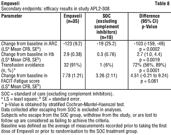 For the secondary efficacy endpoints of change from baseline in ARC, change from baseline in Hb and transfusion avoidance, superiority was demonstrated for Empaveli versus SOC.