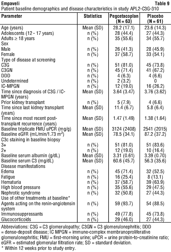A total of 124 patients were randomised, 63 to Empaveli and 61 to placebo. Demographics and baseline disease characteristics were generally balanced between the two groups (see Table 9).