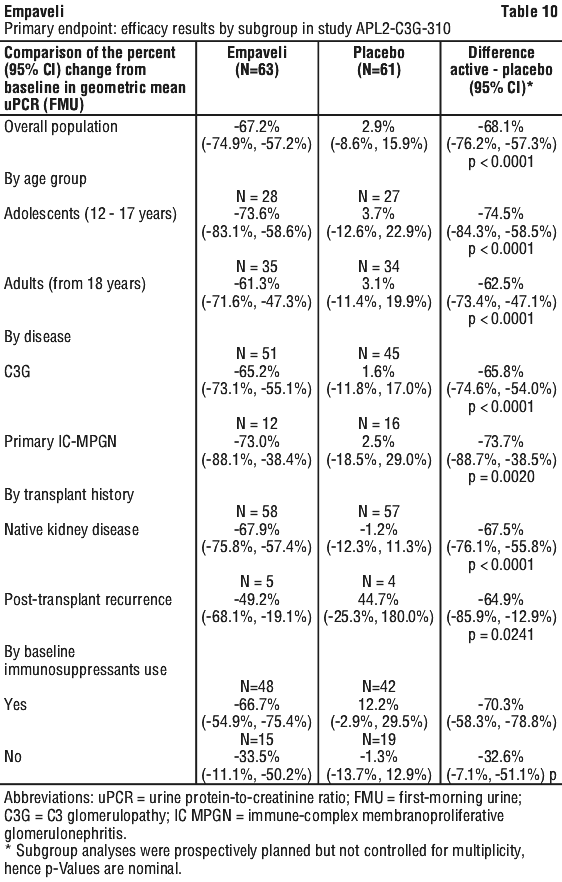 C3G and primary IC-MPGN. The efficacy and safety of Empaveli in patients with C3G or primary IC-MPGN was assessed in the randomised, placebo-controlled, double-blinded Phase 3 Study APL2C3G-310, including adults and adolescents with native kidney or post-transplant recurrent C3G or primary IC-MPGN, and in the open-label, randomised-controlled Phase 2 Study APL2-C3G-204, including adults with post-transplant recurrent C3G or primary IC-MPGN. There is limited data on the safety and efficacy of Empaveli in patients with recurrent IC-MPGN following kidney transplant.