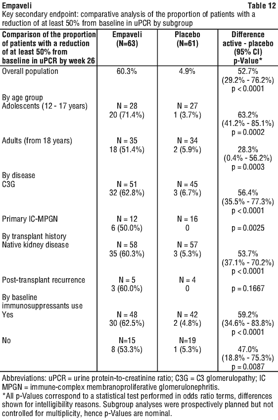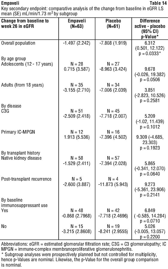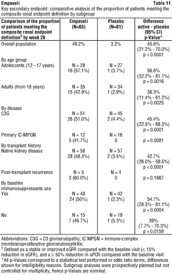 These effects on the key secondary endpoints were consistent in subgroups by age, disease type, transplant status and concomitant use of immunosuppressants/glucocorticoids. Subgroup analyses for the key secondary endpoints at Week 26 are provided in Table 11 to Table 14. Subgroup analyses should be interpreted with caution due to a limited number of participants including a limited number with post-transplant disease recurrent primary IC-MPGN.