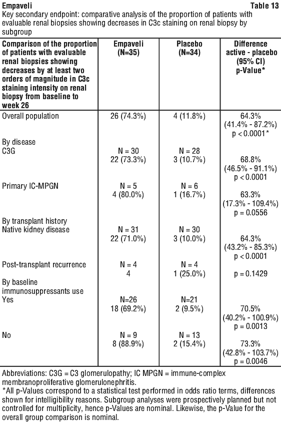 Reduction in C3c staining intensity on renal biopsy at Week 12 was observed in 50% of the patients treated with Empaveli (5 of 10 patients; 95% CI, 18.7%-81.3%; 4 of these patients had a staining score of zero), and 33.3% of the patients in the control group (1 of 3 patients; 95% CI, 0.8-90.6, this patient had a staining score of 1). At Week 52, a reduction in C3c staining intensity on renal biopsy was observed in 53.8% of patients overall (7 of 13 patients; 95% CI, 25.1-80.8). Among those, 6 patients achieved a C3c staining score of zero by Week 52.