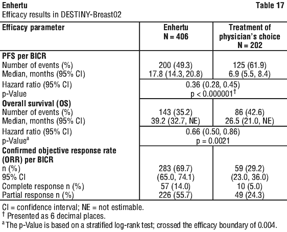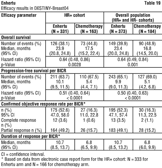 Consistent OS and PFS benefit was observed across prespecified subgroups, including HR status, prior CDK4/6i treatment, number of prior chemotherapies, and IHC 1+ and IHC 2+/ISH-negative status. In the HR subgroup, median OS was 18.2 months (95% CI: 13.6, not estimable) in patients randomised to Enhertu compared to 8.3 months (95% CI: 5.6, 20.6) in patients randomised to chemotherapy with a hazard ratio of 0.48 (95% CI: 0.24, 0.95). Median PFS was 8.5 months (95% CI: 4.3, 11.7) in patients randomised to Enhertu and 2.9 months (95% CI: 1.4, 5.1) in patients randomised to chemotherapy with a hazard ratio of 0.46 (95% CI: 0.24, 0.89).