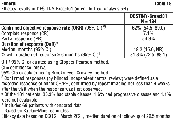 Consistent antitumour activity was observed with Enhertu regardless of prior pertuzumab therapy and hormone receptor status. In DESTINY-Breast01, the subgroup of patients who received prior pertuzumab therapy had a confirmed ORR of 66% (95% CI: 57, 75), and those who did not receive prior pertuzumab therapy had a confirmed ORR of 57% (95% CI: 43, 69). The subgroup of patients who were hormone receptor positive at baseline had a confirmed ORR of 60% (95% CI: 49, 70), and those who were hormone receptor negative at baseline had a confirmed ORR of 68% (95% CI: 56, 77).