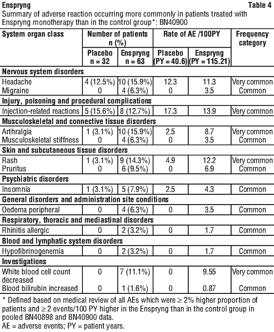 As compared to placebo-treated patients, the need for rescue therapy (e.g. corticosteroids, intravenous immunoglobulin, and/or apheresis [including plasmapheresis or plasma exchange]) was reduced in Enspryng-treated patients by 51% in Study BN40898 and by 55% in Study BN40900 (ITT population). In the AQP4-IgG seropositive subgroup, Enspryng treatment reduced the need for rescue therapy by 61% and 74% in Studies BN40898 and BN40900, respectively (Table 9).