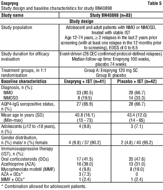 Treatment with Enspryng reduced the risk of experiencing a severe relapse defined as an EDSS increase ≥ 2 points from the previous EDSS assessment by 84% in study BN40898 and by 74% in study BN40900 compared to treatment with placebo (Table 10). The relative reduction in severe relapses in AQP4-IgG seropositive patients was 85% and 79% in studies BN40898 and BN40900, respectively.
