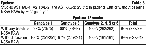 Among the 75 genotype 1 patients who had baseline NS5A RAVs, SVR12 was 97% (67/69) and 100% (6/6) in patients with baseline NS5A RAVs that confer ≤ 100-fold and > 100-fold reduced susceptibility to velpatasvir, respectively. Among the 43 genotype 3 patients who had baseline NS5A RAVs, SVR12 was 94% (15/16) and 85% (23/27) in patients with NS5A RAVS that confer ≤ 100-fold and > 100-fold reduced susceptibility to velpatasvir, respectively. The 4 genotype 3 patients who had baseline NS5A RAVs conferring > 100-fold reduced susceptibility to velpatasvir and failed to achieve SVR12, all had NS5A substitution Y93H at baseline. Twenty one of 25 (84%) genotype 3 patients with baseline NS5A substitution Y93H achieved SVR12.