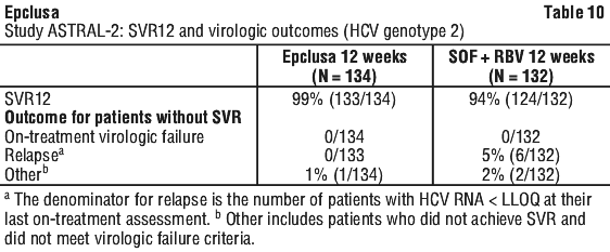 Treatment with Epclusa for 12 weeks demonstrated statistical superiority (p = 0.018) compared to treatment with SOF + RBV for 12 weeks (treatment difference +5.2%; 95% confidence interval: +0.2% to +10.3%).