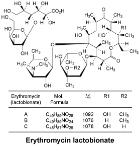 Chemical names: (3R,4S,5S,6R,7R,9R,11R,12R,13S,14R)-4-[(2,6-dideoxy-3-C-methyl-3-O-methyl-α-L-ribo-hexopyranosyl)oxy]-14-ethyl-7,12,13-trihydroxy-3,5,7,9,11,13-hexamethyl-6-[[3,4,6-trideoxy-3-(dimethylamino)-β-D-xylohexopyranosyl]oxy]oxacyclotetradecane-2,10-dione, 4-O-β-D-galactopyranosyl-D-gluconate erythromycin A lactobionate (main component).