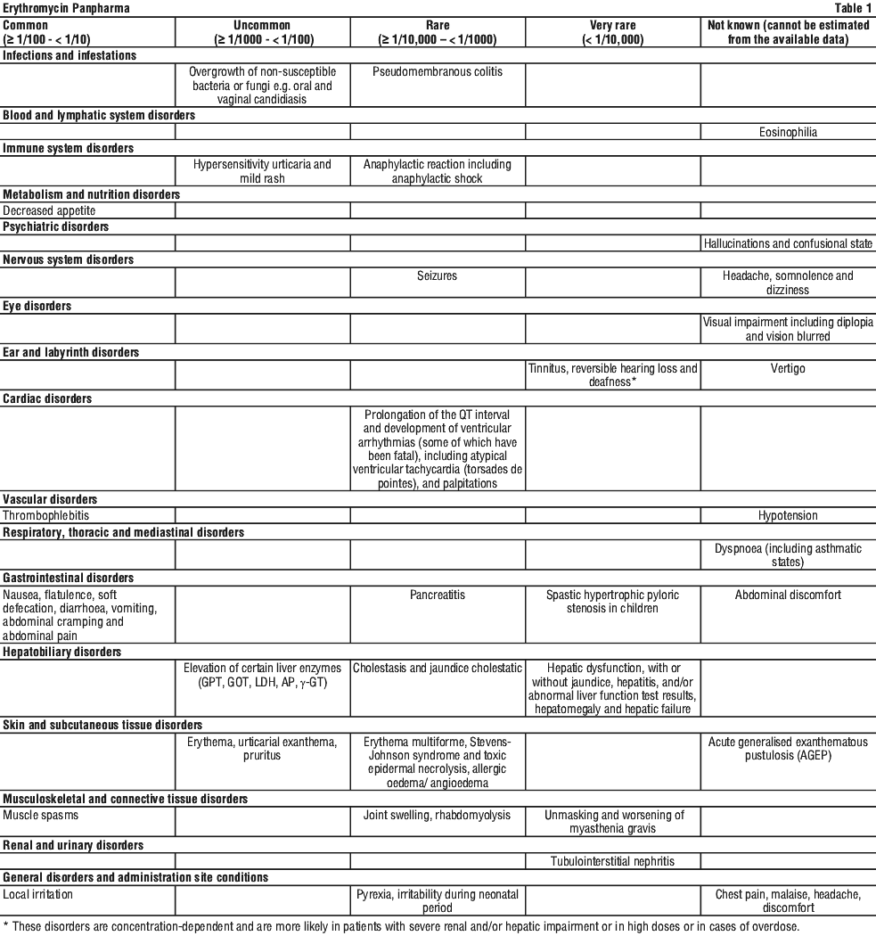 The following adverse effects have been reported for erythromycin. The adverse effects are listed according to the frequency defined as: