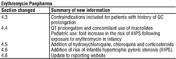 There have been reports of infantile hypertrophic pyloric stenosis (IHPS) occurring in infants following erythromycin therapy. Epidemiological studies including data from meta-analyses suggest a 2-3-fold increase in the risk of IHPS following exposure to erythromycin in infancy. This risk is highest following exposure to erythromycin during the first 14 days of life. Available data suggests a risk of 2.6% (95% CI: 1.5-4.2%) following exposure to erythromycin during this time period. The risk of IHPS in the general population is 0.1-0.2%. Since erythromycin may be used in the treatment of conditions in infants which are associated with significant mortality or morbidity (such as pertussis or chlamydia), the benefit of erythromycin therapy needs to be weighed against the potential risk of developing IHPS. Parents should be informed to contact their physician if vomiting or irritability with feeding occurs.