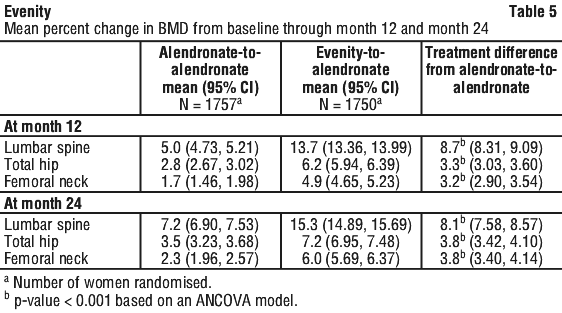 Among women with BMD assessed at baseline and every 6 months, Evenity significantly increased BMD at the lumbar spine, total hip, and femoral neck compared to alendronate alone through month 24. Following the double-blind period, in patients who transitioned from Evenity to alendronate and in patients who continued on alendronate, BMD continued to increase through month 24. The differences in BMD achieved at month 12 between patients who initially received Evenity or alendronate were maintained at month 24 (Figure 3).