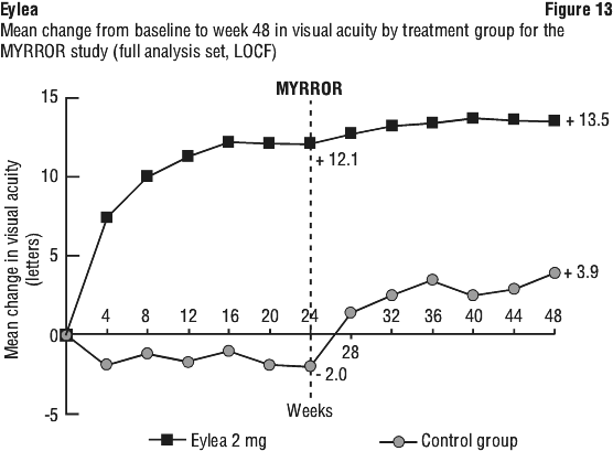 While there were small differences between Eylea and ranibizumab, no clinically relevant differences were seen between the treatment groups across all four secondary efficacy endpoints, based on the confidence intervals for the differences between Eylea and ranibizumab. All statistical tests on secondary efficacy endpoints were considered to be exploratory in the combined analysis of both studies. All secondary endpoint analyses supported the comparability of the efficacy of all 3 Eylea treatment schedules and ranibizumab.