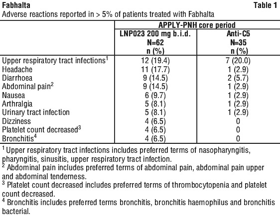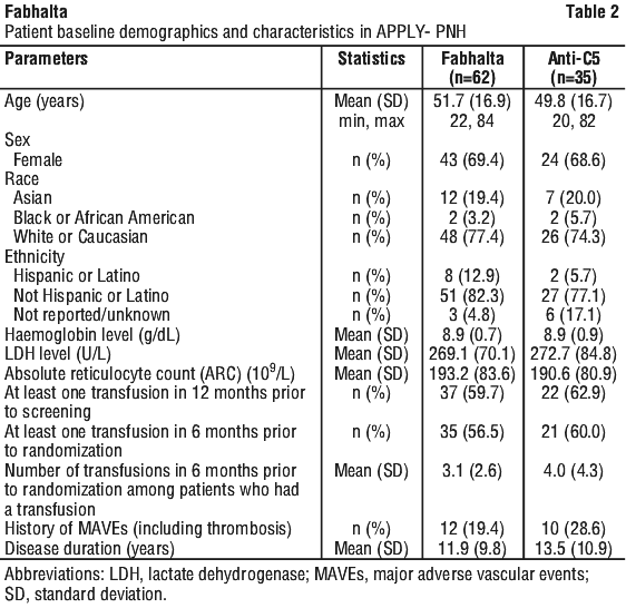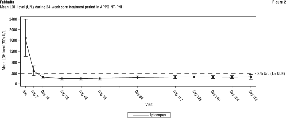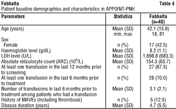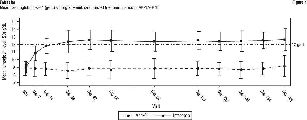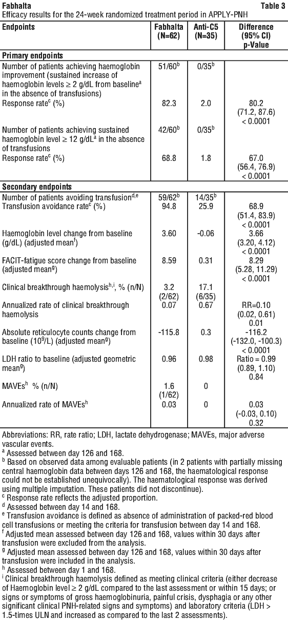 The results for the primary endpoints were consistent across the predefined subgroups studied, including disease duration, age, sex, baseline haemoglobin, history of MAVEs, previous anti-C5 treatment (eculizumab or ravulizumab), the need for transfusion in the last 6 months, number of transfusions in the last 6 months (< 2 or ≥ 2), LDH level at baseline, and duration of previous anti-C5 treatment. Efficacy was based on the primary endpoint assessing the effect of Fabhalta treatment on the proportion of patients achieving haemoglobin improvement (sustained increase of ≥ 2 g/dL in haemoglobin levels from baseline, without a need for RBC transfusion, after 24 weeks). Secondary endpoints included: sustained haemoglobin ≥ 12 g/dL (without a need for RBC transfusion) after 24 weeks, transfusion avoidance, change from baseline in haemoglobin levels, change from baseline in FACIT-Fatigue scores, occurrence of clinical breakthrough haemolysis and change from baseline in absolute reticulocyte counts.