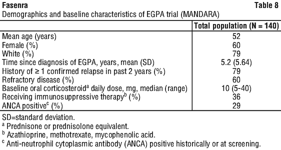 MANDARA. The efficacy and safety of Fasenra was evaluated in a randomised, double-blind, active-controlled, non-inferiority clinical trial of 52-weeks treatment duration, in patients aged 18 years and older with EGPA. A total of 140 patients who has a history of relapsing or refractory disease were randomised. Fasenra 30 mg was evaluated compared to mepolizumab 300 mg administered subcutaneously every 4 weeks in addition to background prednisolone/prednisone with or without immunosuppressive therapy. The OCS dose was tapered at the discretion of the investigator.