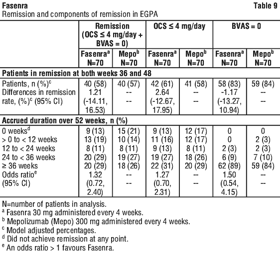 The primary endpoint was the proportion of patients in remission, defined as Birmingham Vasculitis Activity Score (BVAS)=0 (no active vasculitis) plus prednisolone/prednisone dose ≤ 4 mg/day, at both Week 36 and Week 48. As shown in Table 9, Fasenra demonstrated non-inferiority to mepolizumab for the primary endpoint. Results for accrued duration of remission and the components of remission are also shown in Table 9.