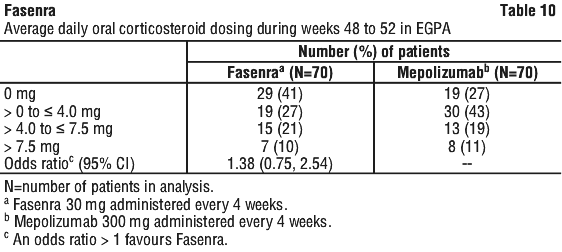 The average daily OCS dose during Weeks 48 to 52 is presented in Table 10. A 100% reduction in the OCS dose was observed in 41% of patients receiving Fasenra compared to 26% of those receiving mepolizumab (difference 15.69%, 95% CI: 0.67, 30.71). Reductions of 50% or higher were observed in 85% of patients receiving Fasenra compared to 74% of those receiving mepolizumab (difference 10.79%, 95% CI: -2.25, 23.83).