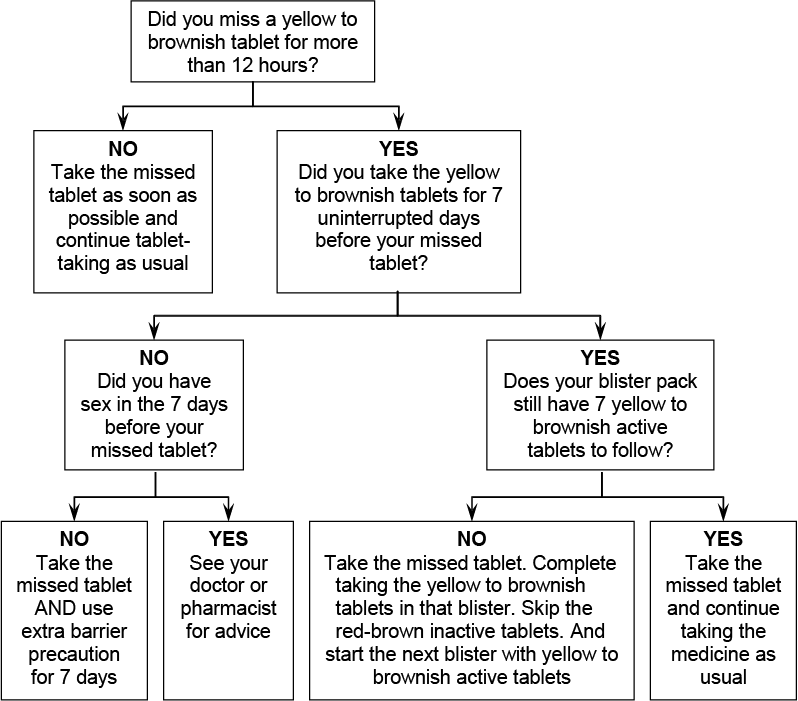 If you vomit within 3 to 4 hours or have severe diarrhoea after taking a yellow to brownish active tablet, the active ingredients may not have been completely absorbed. This should be treated as missing a tablet. Follow the advice above for missed tablets.