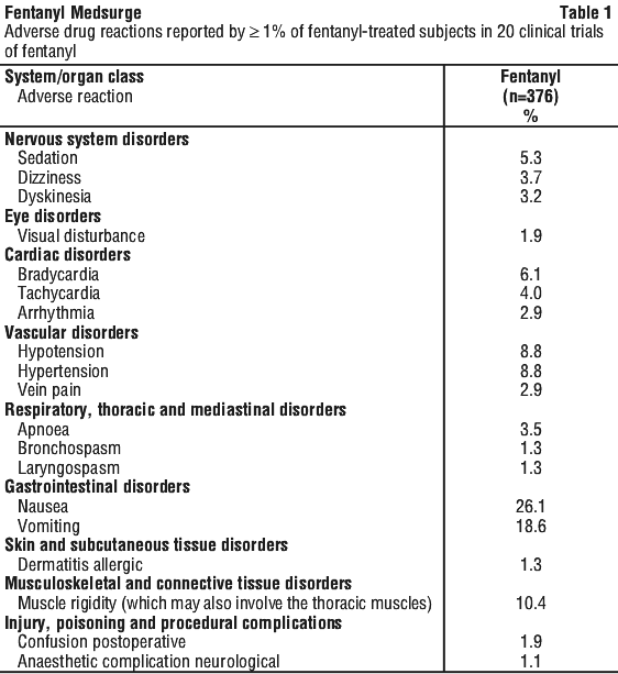 The safety of fentanyl was evaluated in 376 subjects who participated in 20 clinical trials evaluating fentanyl used as an anaesthetic. These subjects took at least one dose of fentanyl and provided safety data. Adverse drug reactions (ADRs), as identified by the investigator, reported for ≥ 1% of fentanyl-treated subjects in these studies are shown in Table 1.
