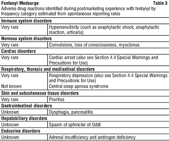 Adverse drug reactions first identified during post-marketing experience with fentanyl are included in Table 3, based on spontaneous reporting rates. The frequencies are provided according to the following convention: very common ≥ 1/10; common ≥ 1/100 and < 1/10; uncommon ≥ 1/1,000 and < 1/100; rare ≥ 1/10,000, < 1/1,000; very rare < 1/10,000, including isolated reports.