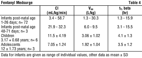 Pharmacokinetic information in children is limited and obtained from different sources. CYP3A4 activity is very low at birth but increases after birth to reach 30-40% of adult levels at 1 month of age. The clearance and volume of distribution adjusted for body weight are higher in infants and children than in adults after iv administration of fentanyl. The terminal elimination half-life is longer in newborn infants. See Table 4.