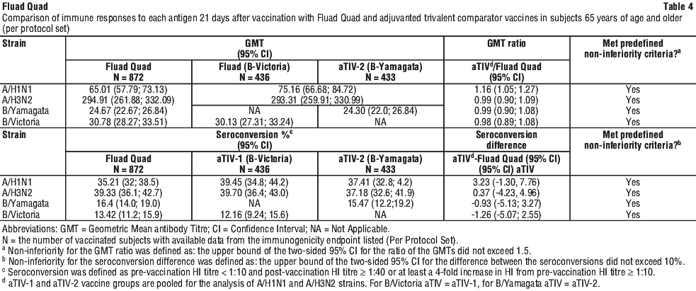 Unsolicited adverse events (AEs) were collected for 21 days after vaccination. The frequency of unsolicited AEs was similar between the different vaccination groups, Fluad Quad (15.3%), Fluad (11.3%) and aTIV-2 (15.3%). Influenza-like-illness (2.0%), injection site bruising (1.1%) and cough (1.0%) were reported in ≥ 1% of subjects who received Fluad Quad.