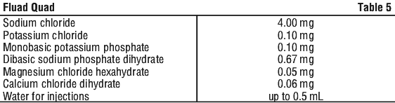 Fluad® Quad may also contain traces of kanamycin sulfate, neomycin sulfate, egg proteins (ovalbumin), formaldehyde, cetrimonium bromide, sucrose, and hydrocortisone as residues of the manufacturing process.