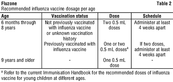 Fluzone should be given in accordance with the national recommendation as per the current Immunisation Handbook.