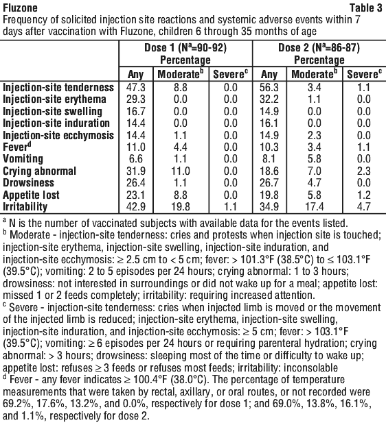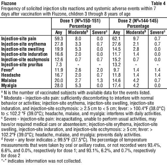 In a multi-centre study conducted in the US (FID07), children 6 months through 35 months of age received two 0.25 mL doses of Fluzone, and children 3 years through 8 years of age received two 0.5 mL doses of Fluzone, irrespective of previous influenza vaccination history. The two doses (year 2006-2007 formulation) were administered 26 to 30 days apart. The safety analysis set included 97 children 6 months through 35 months of age and 163 children 3 years through 8 years of age. Table 3 and Table 4 summarise solicited injection site reactions and systemic adverse events reported within 7 days post-vaccination via diary cards.