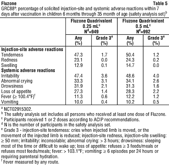 Table 5 summarises solicited injection-site and systemic adverse reactions reported within 7 days post-vaccination via diary cards for the 0.25 mL and 0.5 mL volumes of Fluzone Quadrivalent in children 6 months through 35 months of age.