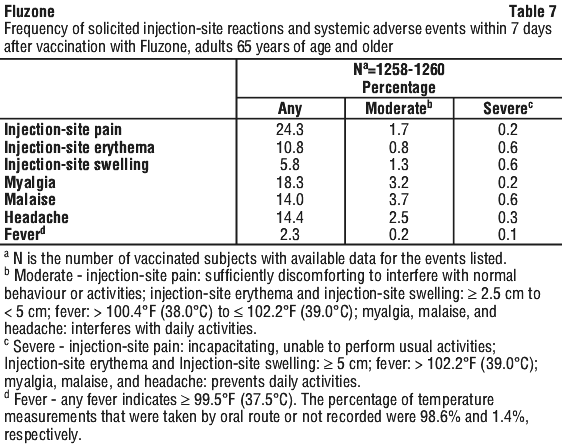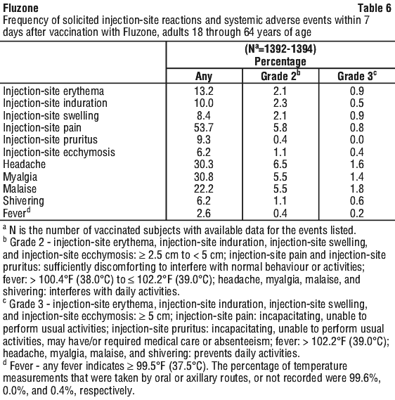 Adults 18 through 64 years of age received Fluzone (year 2008-2009 formulation) in a multi-centre trial conducted in the US (FID31). The safety analysis set included 1421 Fluzone recipients. Table 6 summarises solicited injection-site reactions and systemic adverse events reported within 7 days post-vaccination via diary cards.