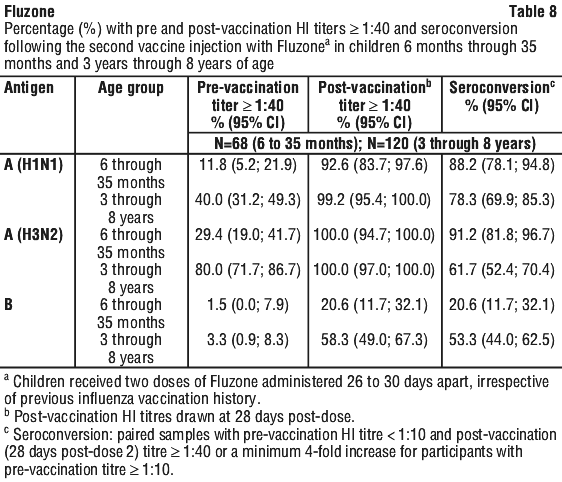 The percentage of participants who received influenza vaccination during the previous influenza season was 54.4% for the 6 months through 35 months age group and 27.5% for the 3 years through 8 years age group. Table 8 shows seroconversion rates and the percentage of participants with an HI titre ≥ 1:40 pre-vaccination and one month following the second dose of Fluzone.