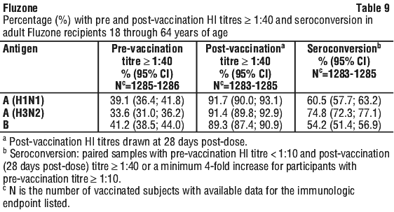 Adults 18 through 64 years of age received Fluzone (year 2008-2009 formulation) in a multi-centre trial conducted in the US (FID31). For immunogenicity analyses, there were 1287 participants who received Fluzone in the per-protocol analysis set. There were fewer males (35.8%) than females. The mean age was 42.6 years (ranged from 18.2 through 65.0 years). Most participants were Caucasian (80.0%), followed by Hispanic (11.0%), and Black (6.3%). Table 8 shows seroconversion rates at 28 days following vaccination and the percentage of participants with an HI titre ≥ 1:40 prior to vaccination and 28 days following vaccination.