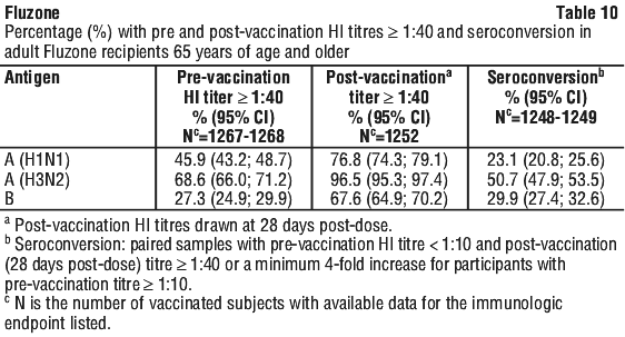 Adults 65 years of age and older received Fluzone (year 2006-2007 formulation) in a multi-centre trial conducted in the US (FIM05). For immunogenicity analyses, there were 1,275 participants who received Fluzone in the immunogenicity analysis set. Females accounted for 54.7% of participants. The mean age was 72.9 years (ranged from 65 through 94 years of age); 36% of participants were 75 years of age or older. Most participants were Caucasian (92.9%), followed by Hispanic (3.7%), and Black (2.7%). Table 10 shows seroconversion rates at 28 days following vaccination and the percentage of participants with an HI titre ≥ 1:40 prior to vaccination and 28 days following vaccination.