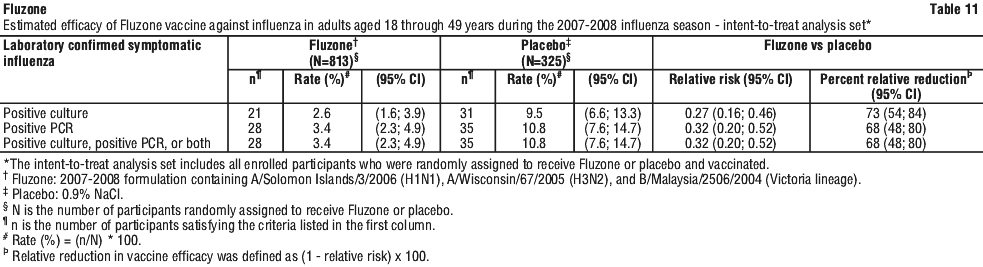 Participants were 18 through 49 years of age (mean age was 23.3 years); 63.3% were female, 83.1% were Caucasian, and 16.9% were of other racial/ethnic groups. Cases of influenza were identified through active and passive surveillance and confirmed by cell culture and/or real-time polymerase chain reaction (PCR). Influenza-like illness was defined as an illness with at least 1 respiratory symptom (cough or nasal congestion) and at least 1 constitutional symptom (fever or feverishness, chills, or body aches). Vaccine efficacy of Fluzone against all influenza viral types and subtypes is presented in Table 11.